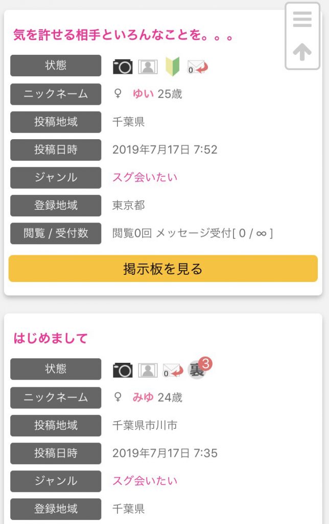 ですので、男性にとっては、男性の掲示板に書き込む(探してもらう)ことと、女性の掲示板を覗く(探す)ことができます。