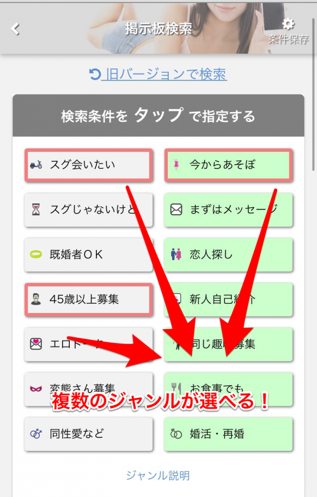 掲示板にはピュアとアダルトがあり、それぞれ7つのジャンルに分かれています。まず希望のジャンルをタップします。(複数選択も可能です。)
